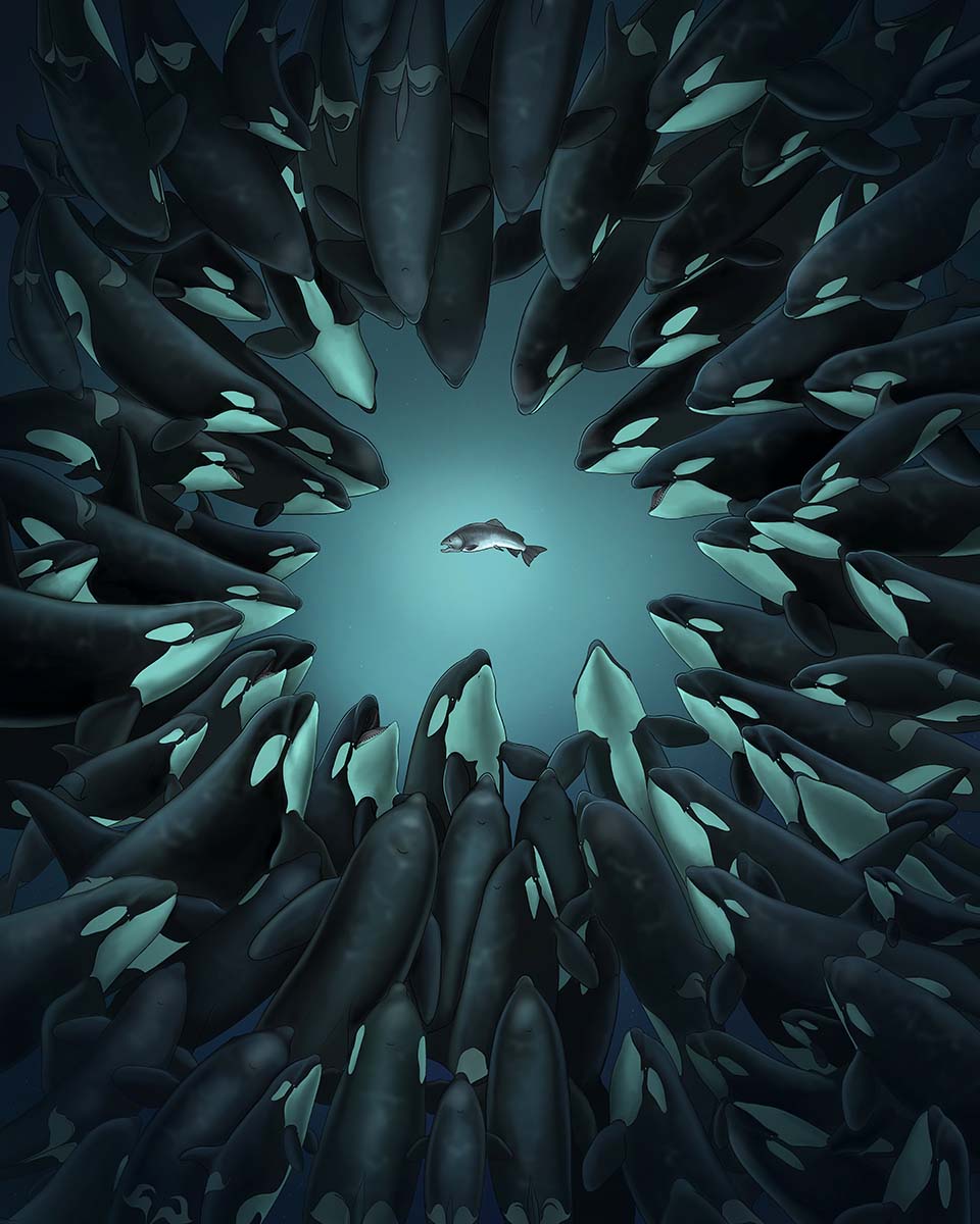 About the Art:: Many years ago, I painted an art piece with a handful of orcas surrounding one salmon. At the time, the message hit home for a lot of people, but it wasn’t as powerful as I needed it to be. I then had the idea to remake the piece but with every living southern resident left in the population. That was it. That was my message. Every living southern resident killer whale fits into one small art piece. How scary is that?