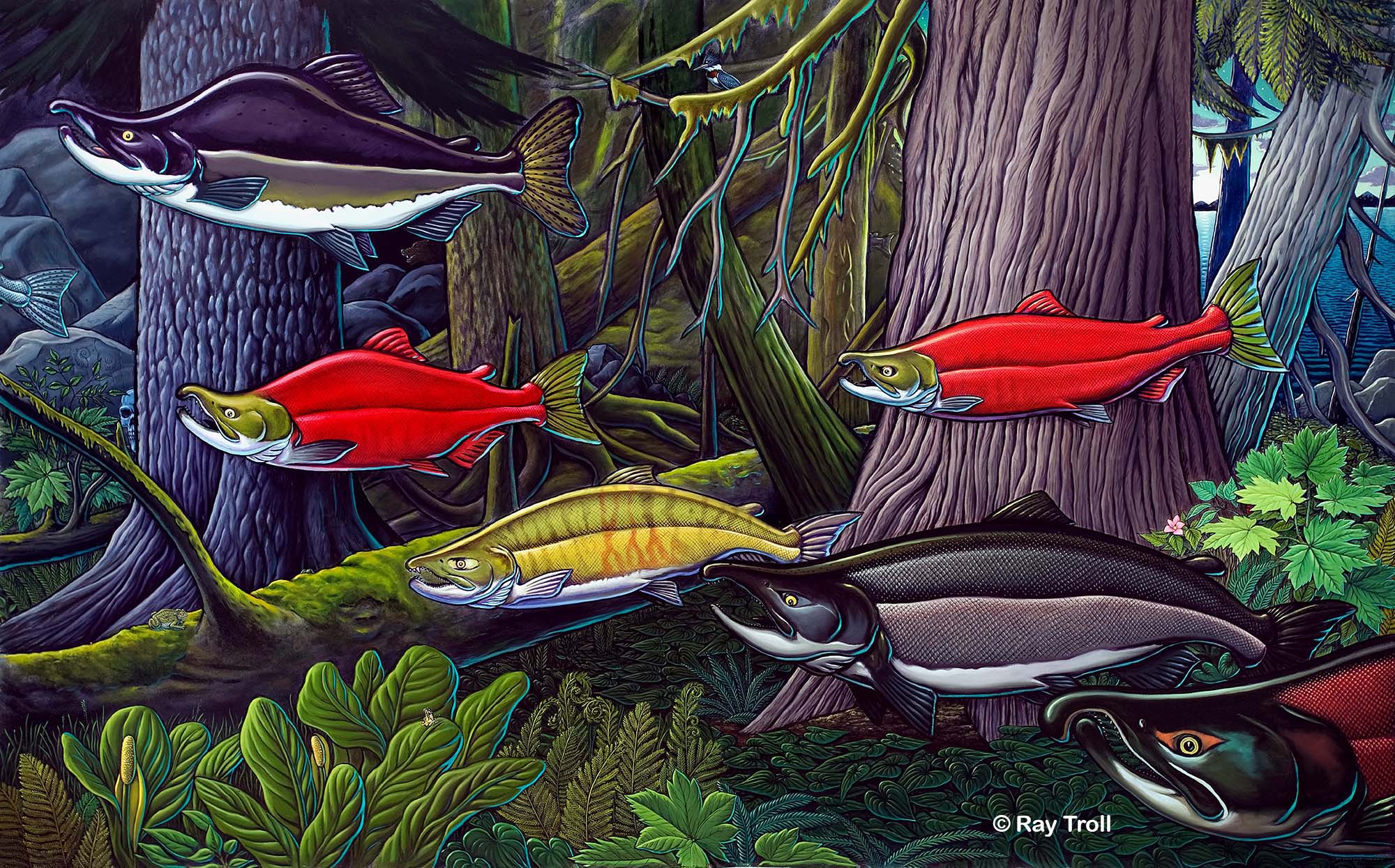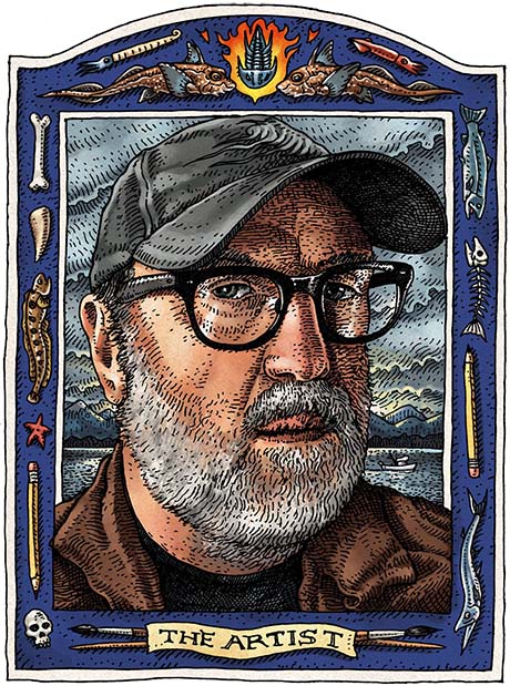 Self PortraitIn his studio on a hill above Tongass Narrows in rainy Ketchikan, Alaska, Ray Troll creates fishy images that swim into museums, books and magazines, and onto t-shirts worn around the world. He draws his inspiration from extensive field work and the latest scientific discoveries, bringing a street-smart sensibility to the worlds of ichthyology and paleontology.