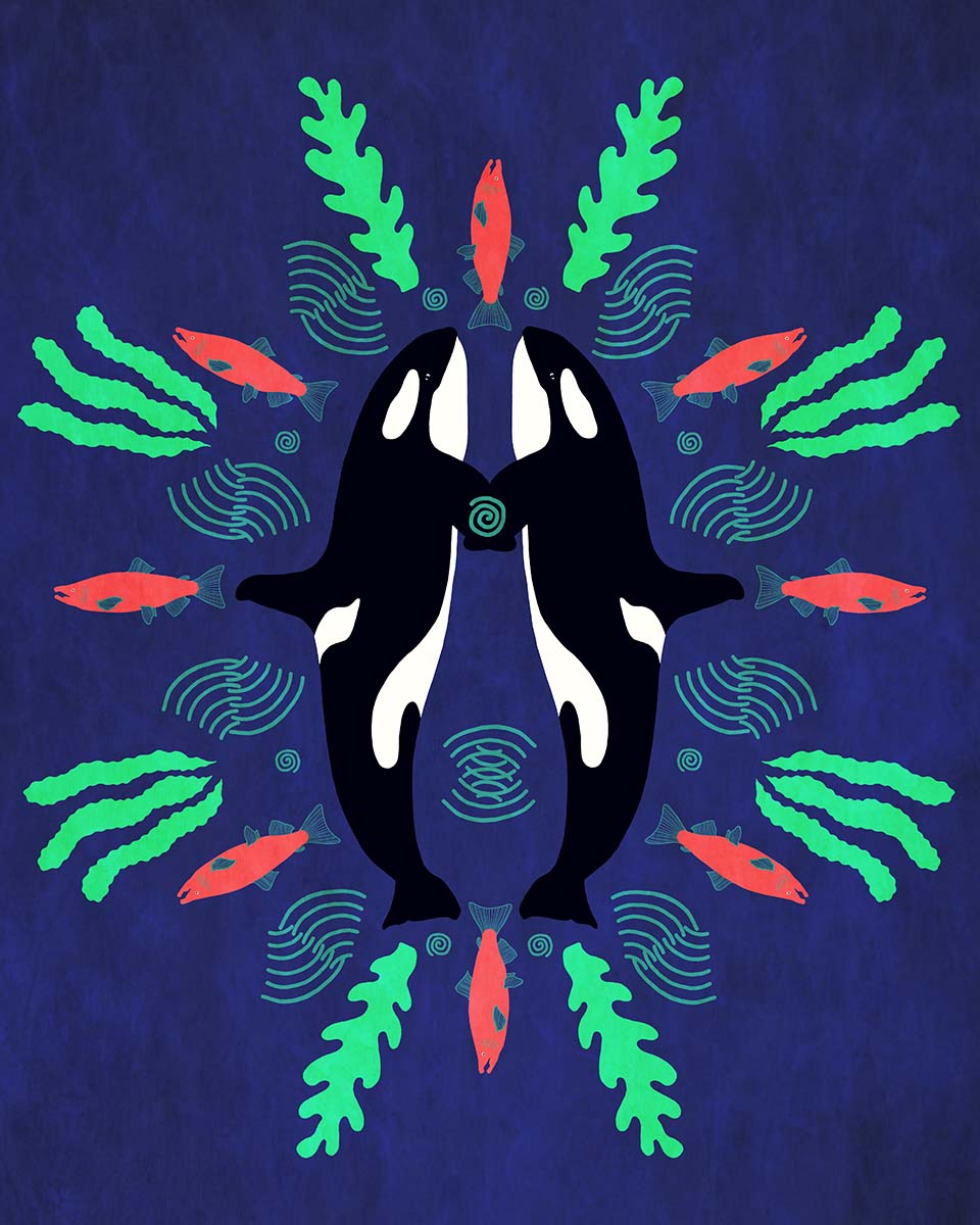 2021 - 12" x 18" - I created “Honoring Natural Cycles” as an homage to the orca salmon connection. The line designs surrounding the orcas represent sonar, which is how they find food and communicate. The spirals represent the life cycles of the salmon and the orca. My heart has been broken since I learned about the struggles of Southern Resident orcas, including starvation caused by overfishing, military sonar effects, and unnecessary dams on rivers. I hope one day they can have their home back with an unlimited food source and a sonar-free atmosphere.