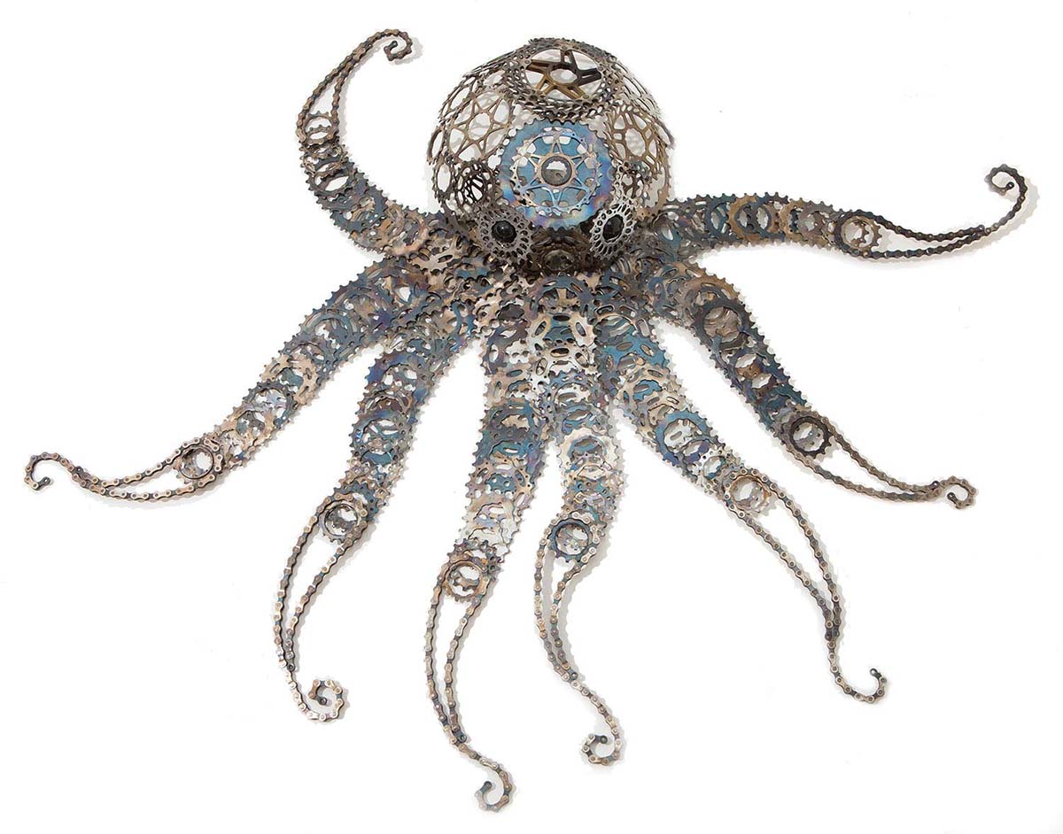 Much of my artwork is inspired by the creatures that call the West Coast home. Ravens, crabs, salmon, halibut, and octopus, etc. My artwork will also always contain at least one bike part that has served a useful life and was diverted from the trash.